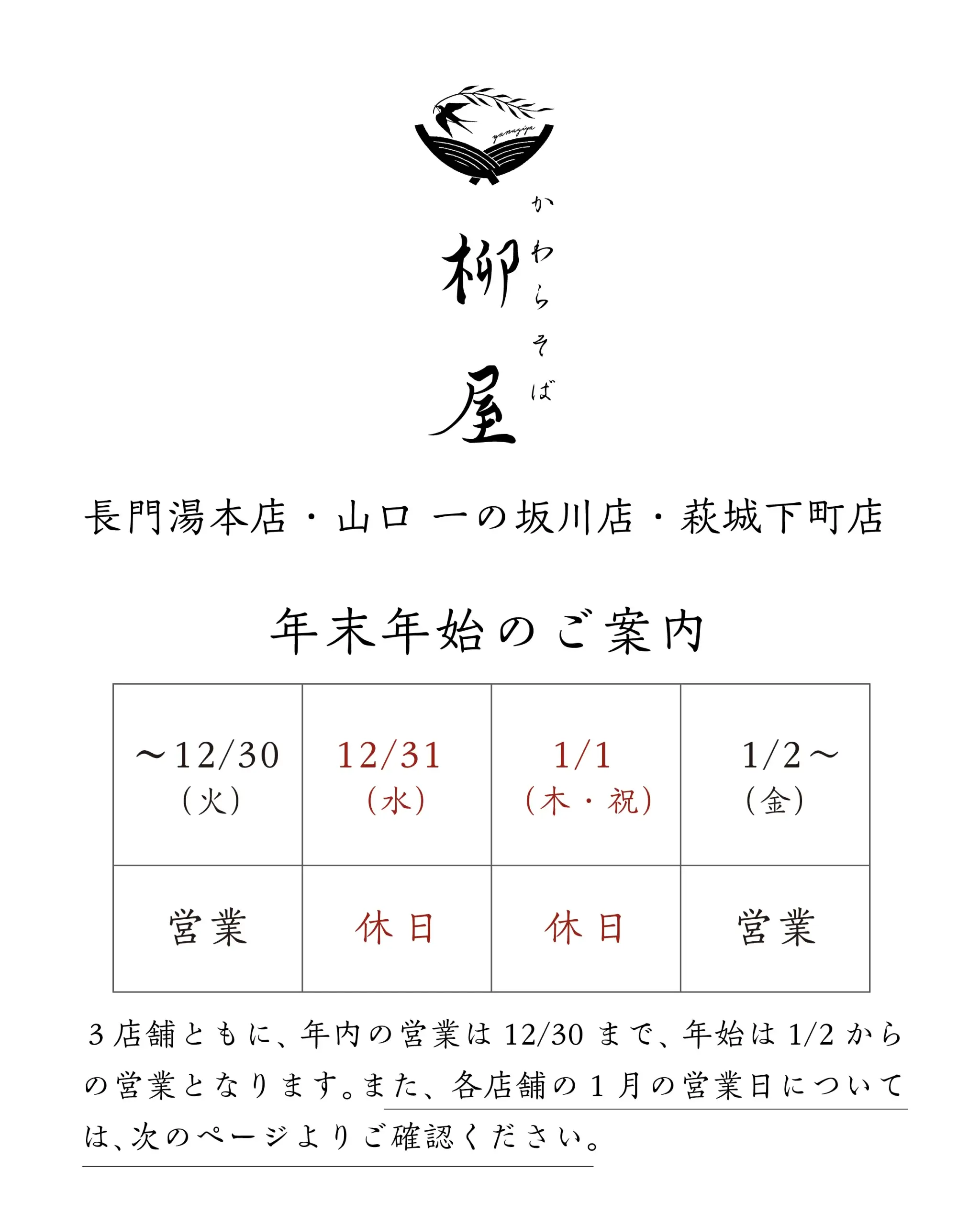 / お知らせ / By 瓦そば柳屋 年末年始の営業につきまして 〜年末年始営業のご案内〜平素より瓦そば柳屋をご愛顧いただき、誠にありがとうございます。瓦そば柳屋の各店舗ではでは、年末年始の営業を以下の通り予定しております。ご来店をご検討のお客様には、ご確認のほどよろしくお願い申し上げます。年内営業:12月30日(火)まで(3店舗共通)年始営業:1月2日(木)より(3店舗共通)※1月4日以降の営業日は、各店舗によって異なります。詳しくは、各店舗の営業日カレンダーをご確認ください。